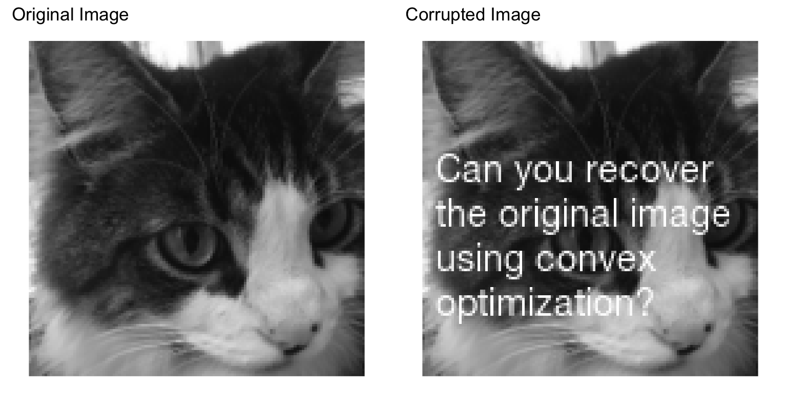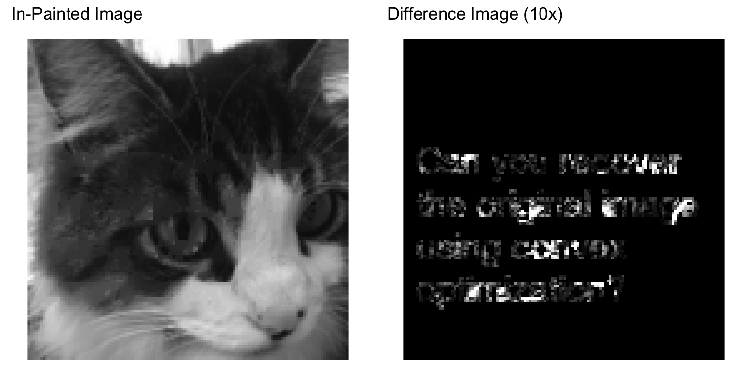 A grayscale image is represented as an matrix of intensities (typically between the values and ). We are given the values , for , where is the set of indices corresponding to known pixel values. Our job is to in-paint the image by guessing the missing pixel values, i.e., those with indices not in . The reconstructed image will be represented by , where matches the known pixels, i.e., for .