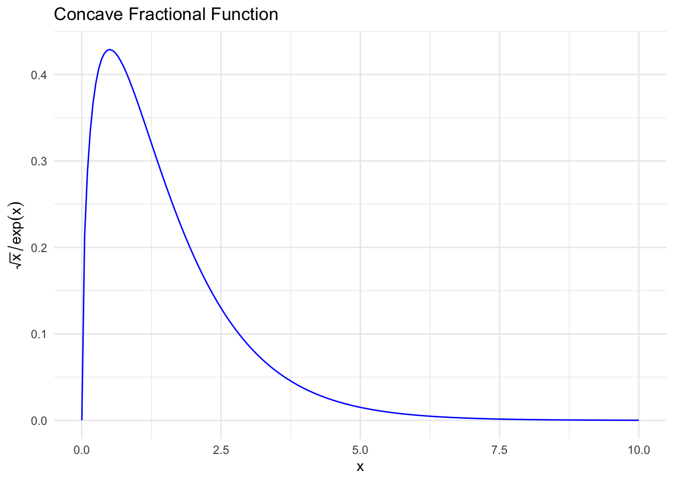 This example shows how to solve a simple concave fractional problem, in which the objective is to maximize the ratio of a nonnegative concave function and a positive convex function. Concave fractional problems are quasiconvex programs (QCPs). They can be specified using disciplined quasiconvex programming (DQCP), and hence can be solved using CVXR.
