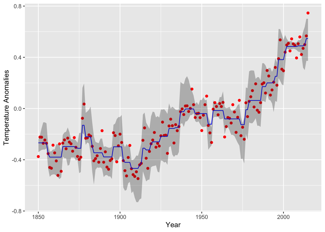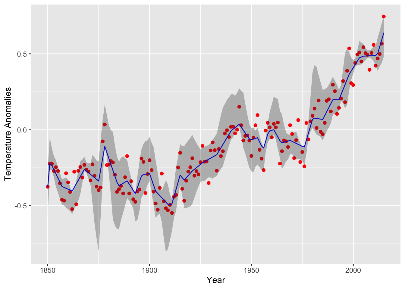 (plot.nearconvex <-ggplot(data = data.nearconvex) +geom_point(mapping =aes(year, annual), color ="red") +geom_line(mapping =aes(year, est), color ="blue") +geom_ribbon(mapping =aes(x = year, ymin = lower,ymax = upper),alpha=0.3) +labs(x ="Year", y ="Temperature Anomalies"))