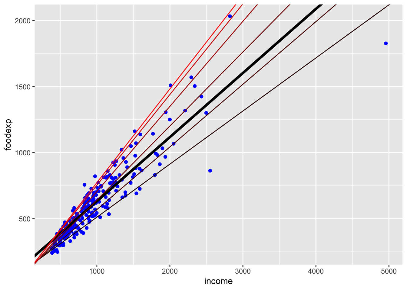 data(engel)p <-ggplot(data = engel) +geom_point(mapping =aes(x = income, y = foodexp), color ="blue")taus <-c(0.1, 0.25, 0.5, 0.75, 0.90, 0.95)fits <-data.frame(coef(lm(foodexp ~ income, data = engel)),sapply(taus, function(x) coef(rq(formula = foodexp ~ income, data = engel, tau = x))))names(fits) <-c("OLS", sprintf("\\(\\tau_{%0.2f}\\)", taus))nf <-ncol(fits)colors <-colorRampPalette(colors =c("black", "red"))(nf)p <- p +geom_abline(intercept = fits[1, 1], slope = fits[2, 1], color = colors[1], linewidth =1.5)for (i inseq_len(nf)[-1]) { p <- p +geom_abline(intercept = fits[1, i], slope = fits[2, i], color = colors[i])}p