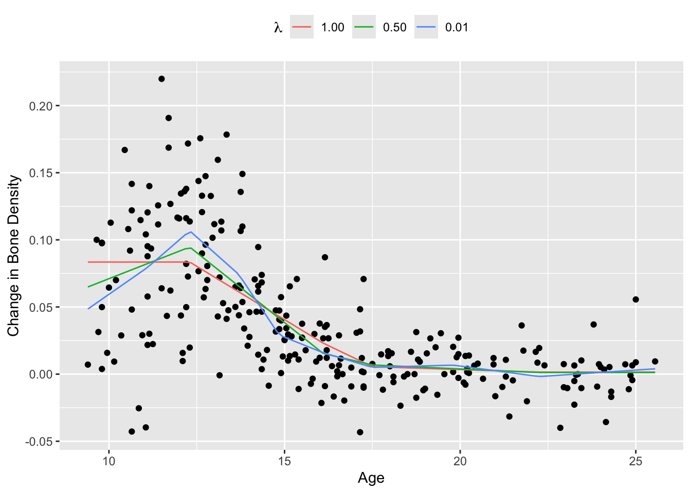 We demonstrate this technique on the bone density data for female patients from Hastie, Tibshirani, and Friedman (2001), section 5.4. There are a total of