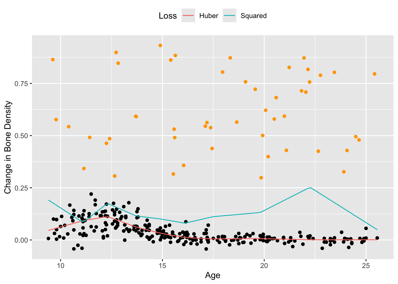 The squared error loss works well in this case, but the Huber loss is preferred when the dataset contains large outliers. To see this, we add 50 randomly generated outliers to the bone density data and re-estimate the saturating hinges.