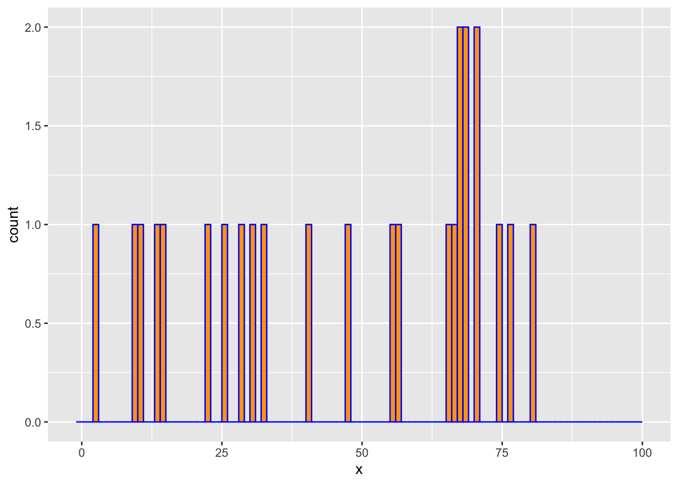 geom_histogram(mapping = aes(x = x), breaks = -1:K, color = "blue", fill = "orange")