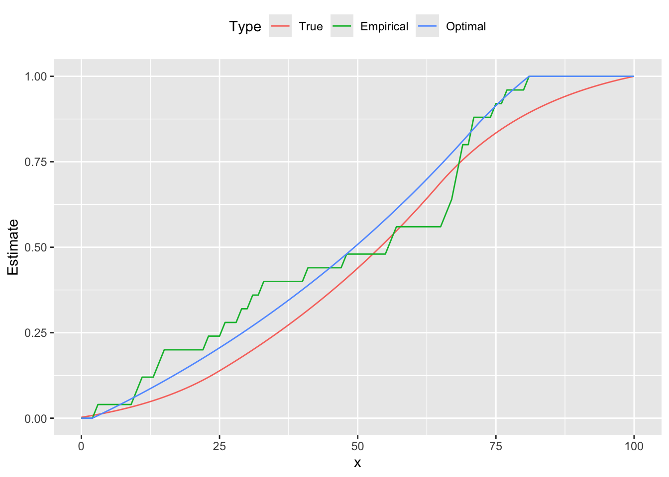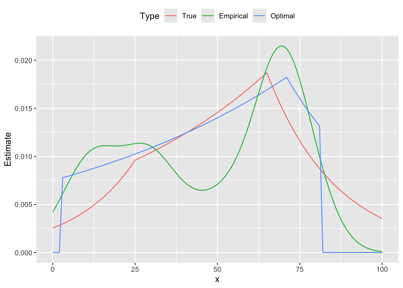 d <- data.frame(x = xrange, True = xprobs, Optimal = pmf,